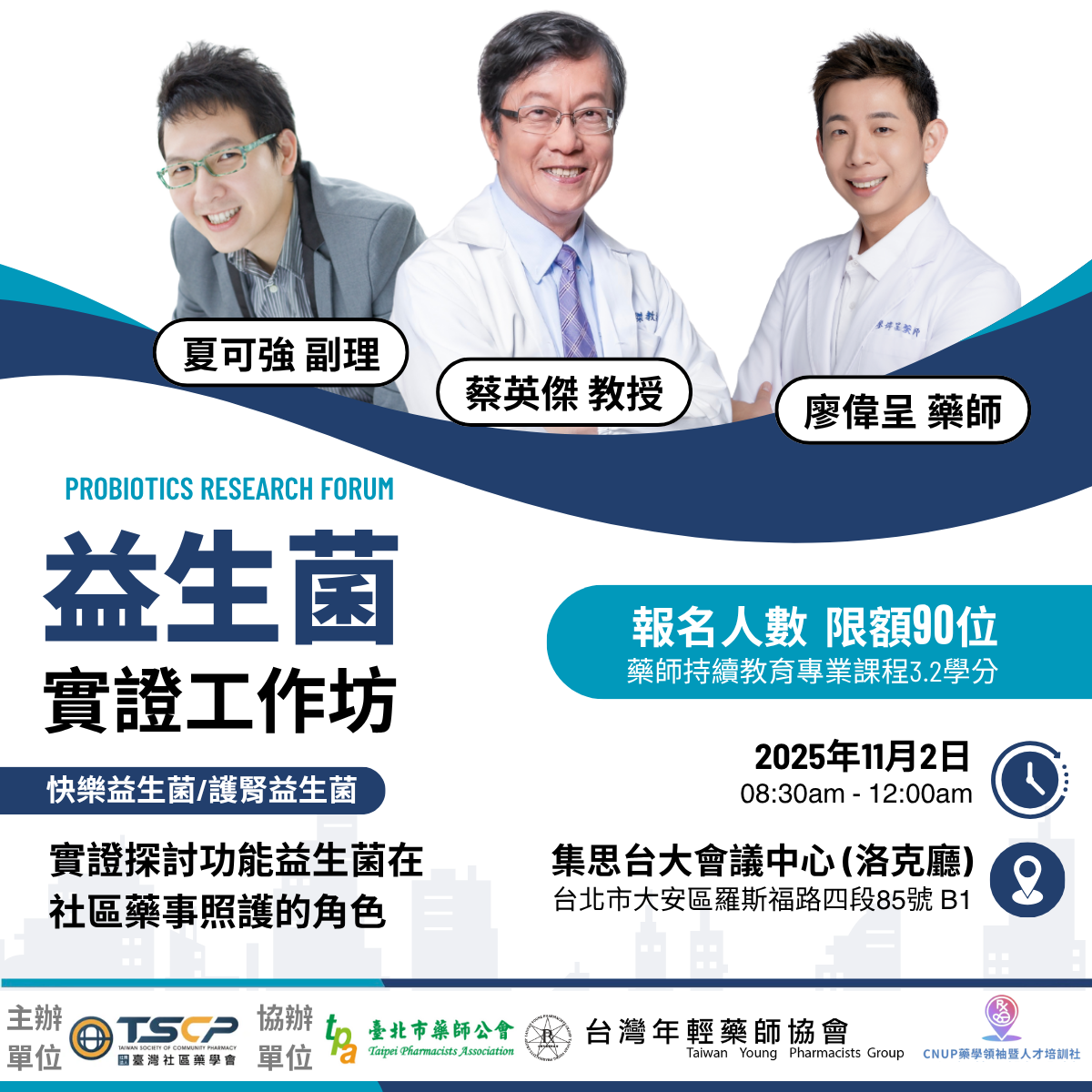 | 09:10–10:10 | PS128 快樂益生菌:從科研到臨床實證,延伸至社區藥局的應用 |